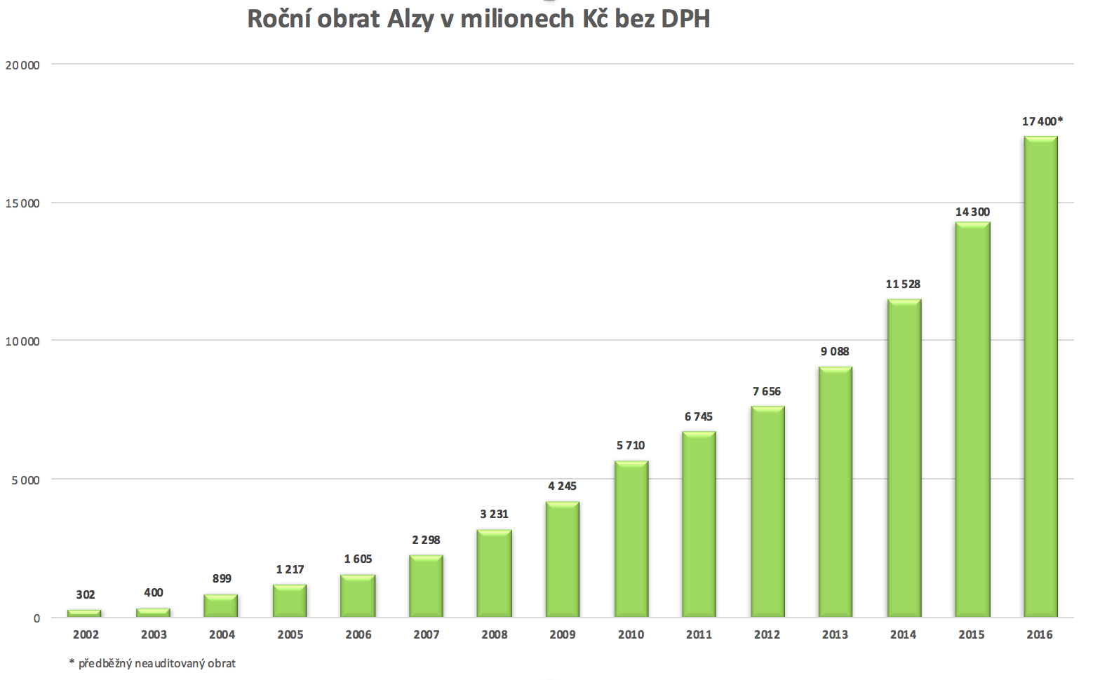 Podle předběžných výsledků dosáhla Alza.cz v roce 2016 rekordních tržeb ve výši 17,4 miliardy korun bez DPH (21 miliard korun včetně DPH). Meziroční růst činil 22 %.