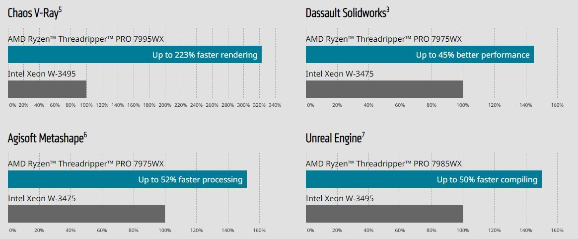 AMD uvádí, že 96jádrový Ryzen Threadripper PRO 7995WX poskytne až o 223 % vyšší výkon při vykreslování ve V-Ray než konkurenční vlajková loď společnosti Intel. Neméně důležité je, že AMD slibuje až o 73 % nižší spotřebu energie na jádro a 2,2× lepší poměr výkonu a spotřeby než u srovnatelných čipů od Intelu. Tyto informace je však samozřejmě nutné brát alespoň prozatím s rezervou – na druhou stranu pokoření hranice 100 000 bodů v benchmarku Cinebench R23 provedeném portálem Tom's Hardware nám dává ledacos tušit. Velmi zajímavých výsledků se dostalo také pracovníkům portálu PCmag.com.