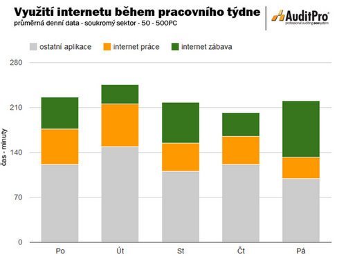 „Z pěti pracovních dní je to právě pátek, kdy se na pracovních počítačích zaměstnanci nejméně věnují práci a řeší na internetu soukromé záležitosti,“ shrnul její závěry Martin Hnízdil, manažer AuditPro ze společnosti truconneXion.