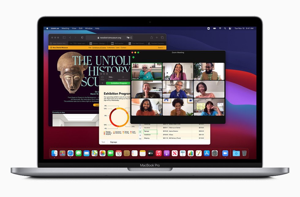Výbava dále čítá např. vylepšený signálový procesor, který zlepší kvalitu obrazu produkovaného webkamerou i kvalitu zvuku z mikrofonů. Osazený Retina displej pak podporuje barevný prostor P3 a nově nechybí ani Wi-Fi 6 nebo dvojice USB-C portů s podporou Thunderbolt a USB 4.