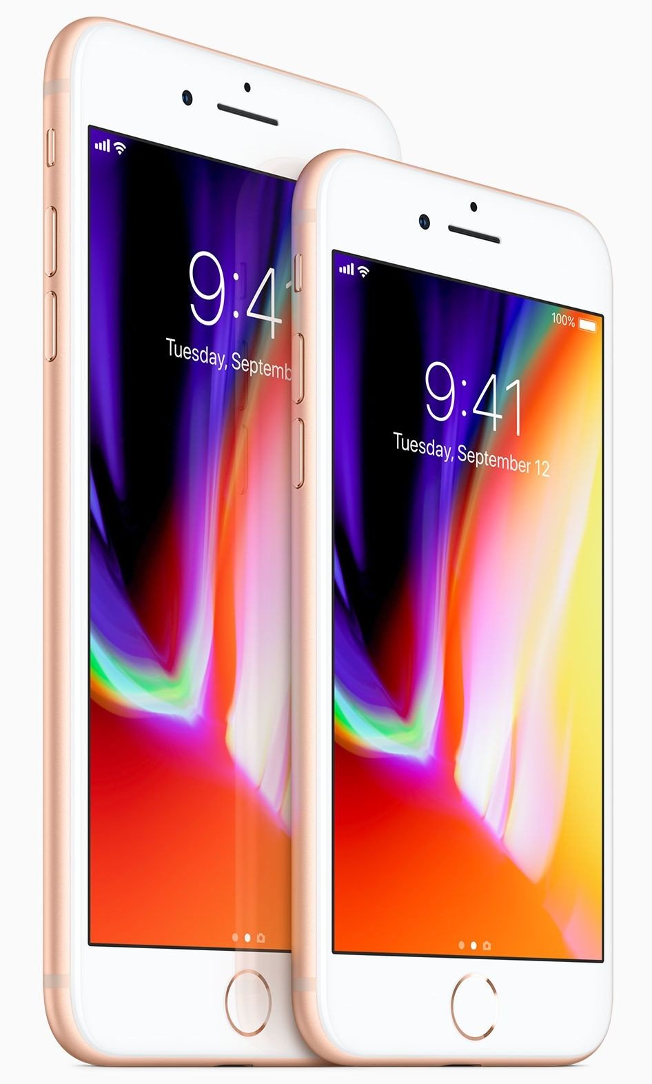 Již méně dramatické změny Apple přichystal v případě modelů iPhone 8 (úhlopříčka obrazovky 4,7 palců a rozlišení 1 334 x 750 bodů) a iPhone 8 Plus (úhlopříčka 5,5 palce a rozlišení 1 920 x 1 080 bodů). Zákazníci se mohou těšit například na konstrukci ze skla a hliníku odolnou proti vodě, výkonnější čip, bezdrátové nabíjení nebo podporu rozšířené reality. Fotoaparát má rozlišení 12 megapixelů a disponuje například novými barevnými filtry, hlubšími pixely a optickou stabilizací. Video lze nahrávat až v rozlišení 4K při frekvenci 60 fps. V případě modelu Plus je připraven duální snímač kombinující širokoúhlý objektiv a teleobjektiv. Stejně jako v případě iPhone X je i zde použit čip Apple A11 Bionic.