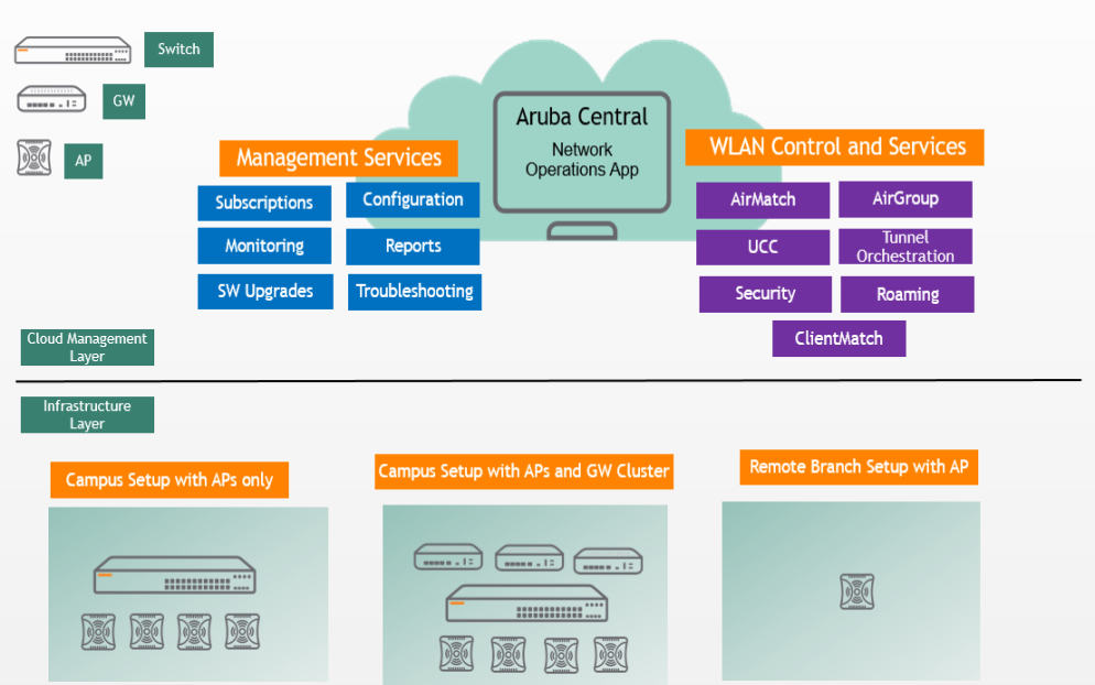 b) Cloud Management – tuto vrstvu reprezentuje Aruba Central se službami Management services a WLAN Control services.