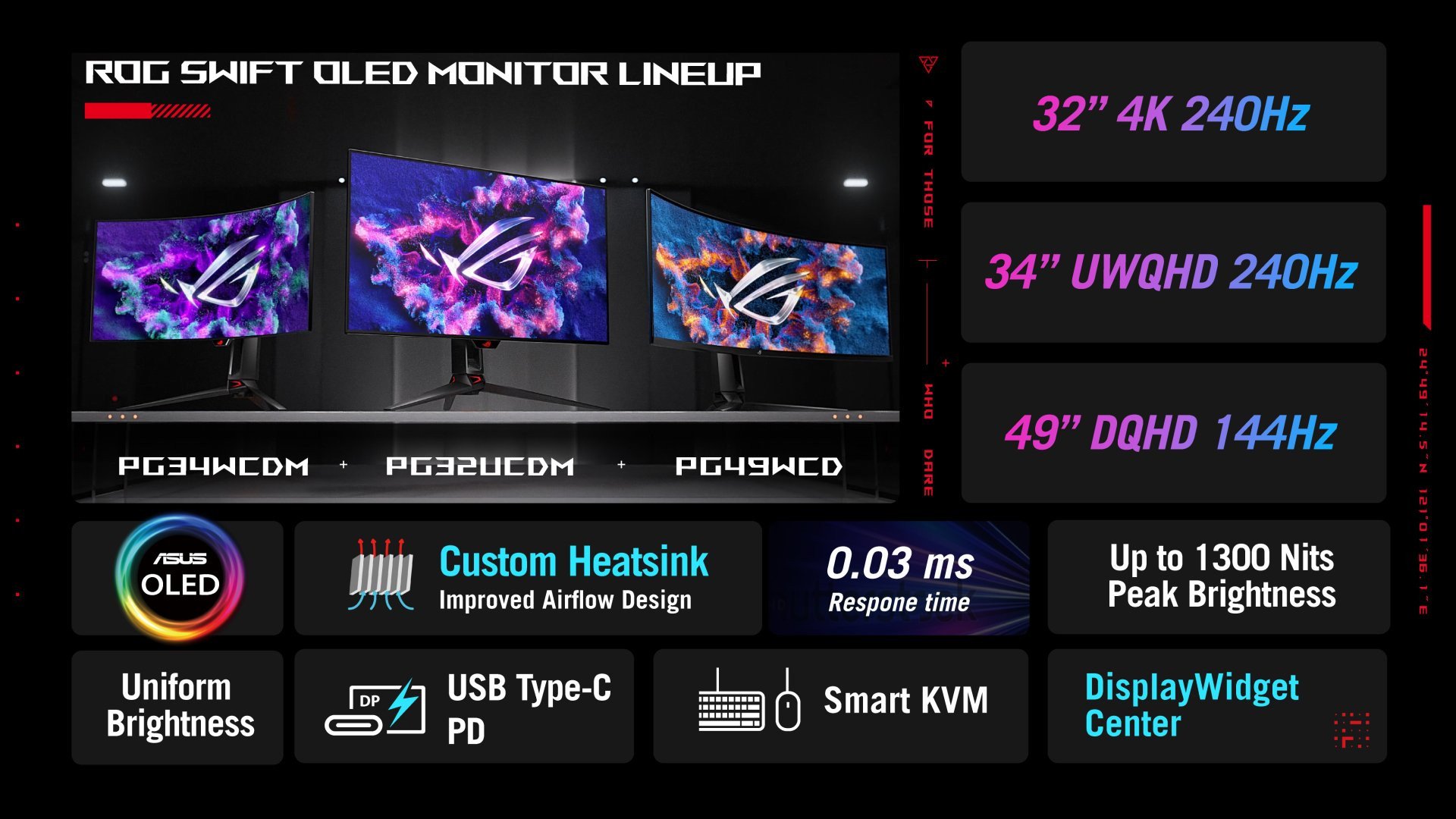 Monitor ROG Swift OLED PG49WCD je 49" herní OLED monitor se super-ultraširokoúhlým displejem (5 120 × 1 440), panelem QD-OLED 1 800R s obnovovací frekvencí 144 Hz a dobou odezvy 0,03 ms. Pro lepší výkon a zajištění dlouhé životnosti panelu QD-OLED obsahuje PG49WCD vlastní chladič a grafenovou fólii pro lepší odvod tepla, která snižuje riziko vypalování a zvyšuje maximální jas až na 1 000 nitů. Vestavěná funkce Smart KVM umožňuje uživatelům ovládat dvě zařízení pomocí jedné klávesnice a myši, a to vše bez nutnosti použití specializovaného softwaru nebo dalšího hardwaru. Uživatelé mohou přenášet soubory mezi oběma vstupními zařízeními prostřednictvím superrychlého připojení USB 3.2. Monitor nabízí celou řadu možností připojení včetně portu USB-C s funkcí nabíjení zařízení až 90 W, DisplayPort 1.4 a HDMI 2.1. Monitor PG49WCD bude v prodeji od října 2023 a jeho cena bude 1 499 dolarů.