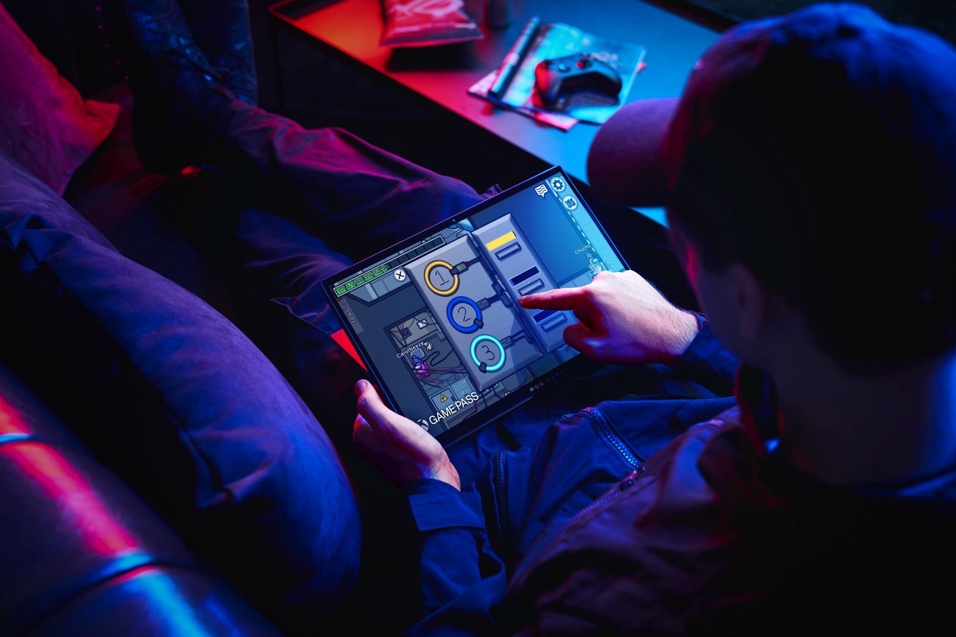 Zařízení ROG Flow Z13, který je podle svého výrobce dosud nejvýkonnějším herním tabletem na světě. Z13 kombinuje ty nejlepší vlastnosti tabletů a notebooků s cílem poskytnout zcela nový herní zážitek. Tablet umožňuje různé způsoby hraní – s klávesnicí a myší, s gamepadem nebo třeba s dotykovým ovládáním. A pokud je potřeba výkon navíc, stačí připojit externí grafickou kartu.