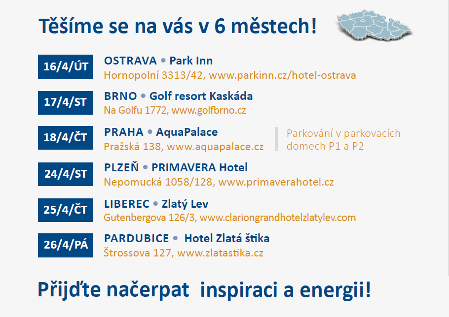 ATC zákazníky a obchodní partnery uvítá 16. dubna v ostravském Park Innu, 17. dubna v brněnském Golf resortu Kaskáda, 18. dubna v pražském Aquapalace, 24. dubna v plzeňském Primavera hotelu, 25. dubna v libereckém hotelu Zlatý lev a 26. dubna v pardubickém hotelu Zlatá štika. RoadShow bude pokračovat na Slovensku, a to v Košicích, Banské Bystrici a Žilině od 4. do 6. června 2019.