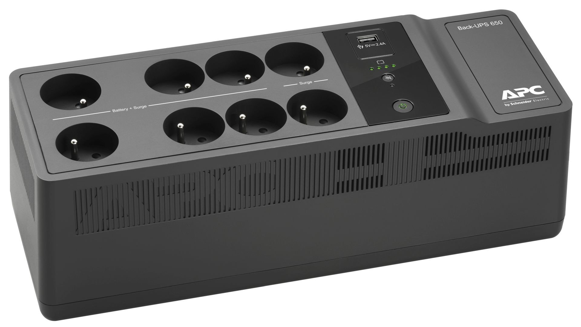 Jde o bateriový záložní zdroj s ochranou proti přepětí, který je svou kapacitou a výkonem ideální pro elektronická zařízení a počítače. Back-UPS 650 VA udržuje napájecí kapacitu pro připojená zařízení vyžadující záložní baterii a současně poskytuje samostatnou ochranu proti přepětí pro méně kritická zařízení. Disponuje celkem osmi zásuvkami, které všechny chrání proti přepětí (šest je zálohovaných), a jedním nabíjecím USB portem.