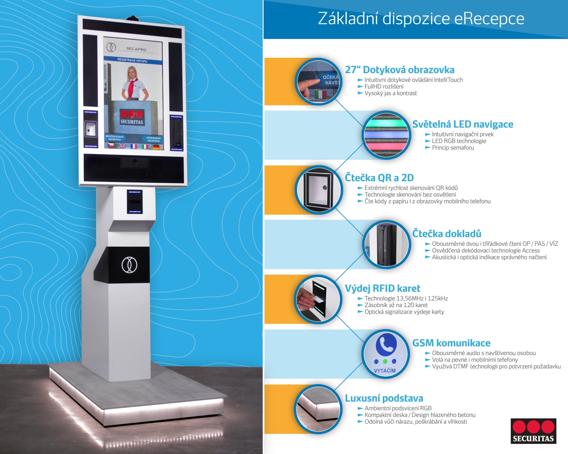 „Naše eRecepce může pomoci tam, kde se firmy potýkají s nedostatkem zaměstnanců, vysokými náklady na provoz recepce nebo chtějí z důvodu protiepidemických opatření snížit riziko nákazy. Řešení spojuje návštěvní i informační systém, a zvládne tak široké spektrum úkolů,“ řekl Jan Huml, technický ředitel SECURITAS ČR. Jednoduché minimalistické provedení eRecepce lze designem přizpůsobit charakteru budovy či konkrétní společnosti.