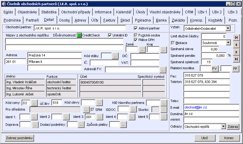 „Abychom svým zákazníkům přinesli konkurenční výhodu a podpořili je v jejich podnikání, zahájili jsme spolupráci se společností Credit Check, která nabízí bezplatnou možnost včasného otestování bonity obchodního partnera prostřednictvím webové služby Creditcheck. Tato služba umožňuje předcházet řadě rizikových situací, mezi které patří například neplacení závazků, druhotná platební neschopnost, nadměrné úvěrování odběratelů, problémy s hotovostí či vymáhání pohledávek a s tím spojené další náklady,“ uvedl Jiří Rákosník, obchodní ředitel společnosti J.K.R.