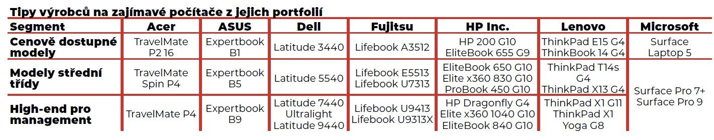 Vedle notebooků s klasickým provedením jsou k dispozici různé typy konvertibilních zařízení s otočnými displeji či oddělitelnými klávesnicemi. Jejich nabídka sice není tak pestrá jako u standardních přenosných PC, ale rozhodně je z čeho vybírat a např. modely s dotykovými displeji (v kombinaci se stylusem) mohou mít v byznysovém prostředí své opodstatnění.
