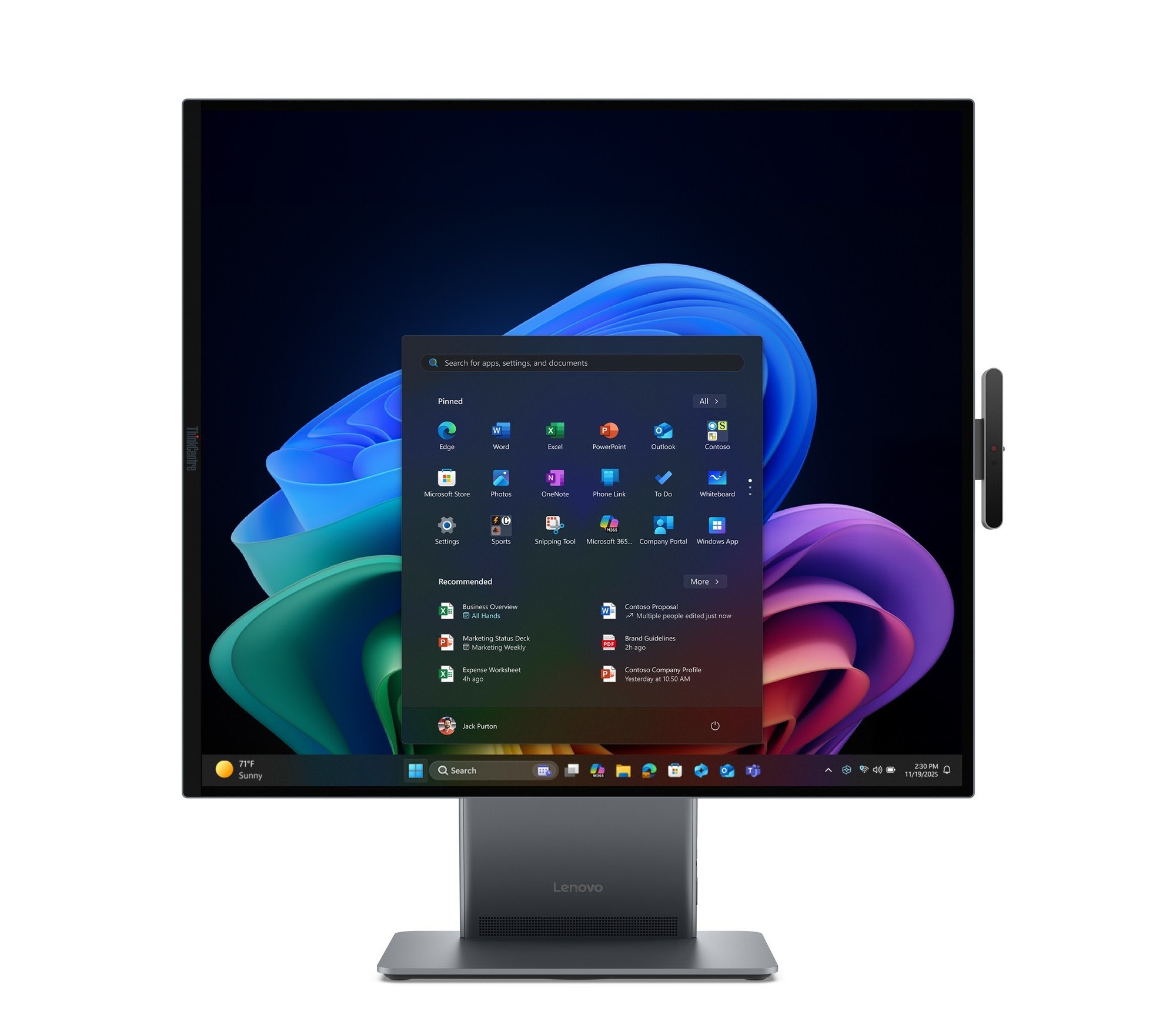 ThinkCentre X AIO Aura Edition Copilot+ PC nabízí 27,6" QHD displej s poměrem stran 16:18, který poskytuje jedinečnou, téměř čtvercovou zobrazovací plochu ideální pro tvůrce, programátory a datové profesionály, kteří těží ze zobrazení dvou stránek formátu A4 nebo plných datových sad v přehledném zobrazení na výšku. Díky procesorům Intel Core Ultra Series 3 poskytuje efektivní výkon napříč řadou profesionálních workflow. Volitelná chytrá kamera s umělou inteligencí podporuje Lenovo DeskView, který je poháněný softwarem Lenovo AI Turbo Engine, a dokáže digitalizovat dokumenty umístěné před obrazovkou pro okamžité sdílení, zatímco čtyři reproduktory Harman Kardon a kvad‑mikrofonní pole umožňují spolupráci ve studiové kvalitě. S funkcí Lenovo Share Zone se AIO stává současně počítačem i monitorem, kdy rozdělí obrazovku na dvě části a zobrazuje obsah AIO v jedné sekci a v druhé obsah z připojeného externího zařízení.