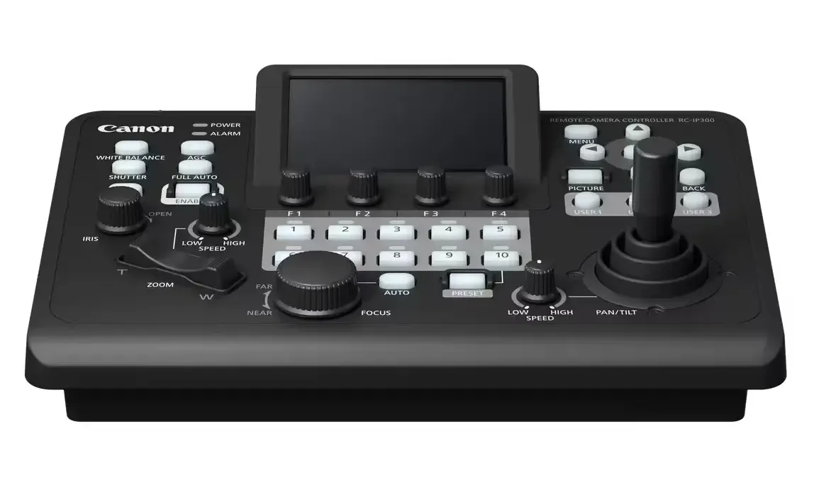 Canon dále představil kompaktní a výkonný PTZ ovladač RC ‑IP300 pro moderní vícekamerové produkce. Ovladač byl navržen tak, aby umožnil správu složitých sestav s až 200 kamerami jediným operátorem. Lze vytvářet skupiny kamer a ukládat až 100 předvoleb pro každou kameru s možností okamžitého vyvolání a opakovatelné kompozice.