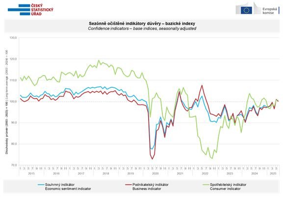 Souhrnný indikátor důvěry ČSU, vyjádřený bazickým indexem, se meziměsíčně snížil o 0,9 bodu na hodnotu 100,1, při rozdílném vývoji obou jeho složek. Indikátor důvěry podnikatelů poklesl o 1,0 bodu na hodnotu 100,0, zatímco indikátor důvěry spotřebitelů se nezměnil a zůstal na květnové hodnotě 100,7.