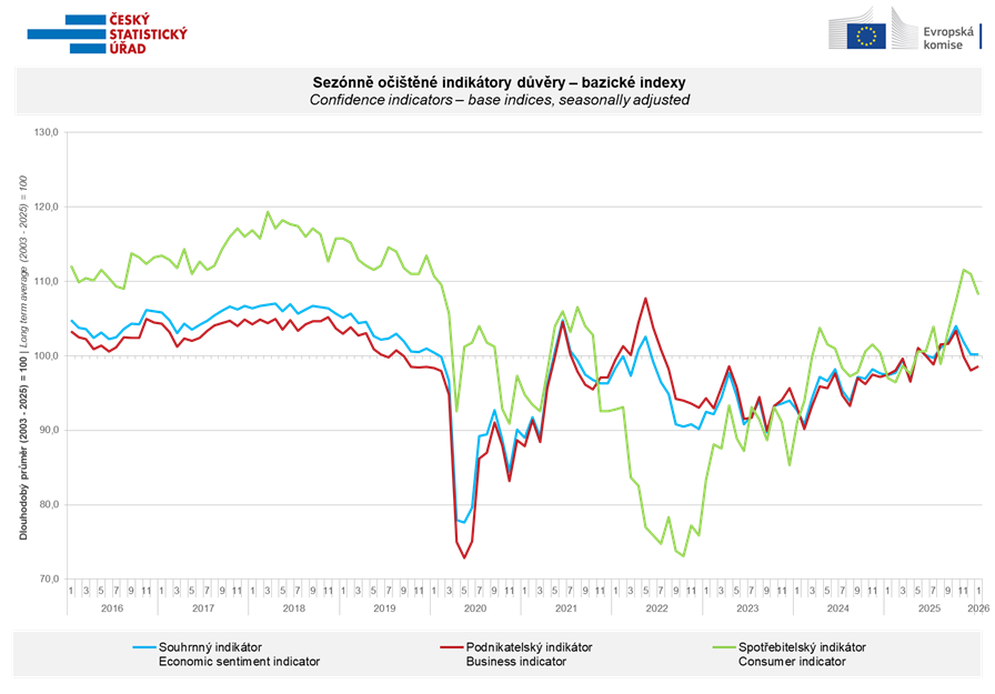 Souhrnný indikátor důvěry ČSU, vyjádřený bazickým indexem, se v lednu 2026 meziměsíčně nezměnil a zůstal na prosincové hodnotě 100,2. Zatímco indikátor důvěry podnikatelů se mírně zvýšil o 0,6 bodu na hodnotu 98,6, indikátor důvěry spotřebitelů poklesl o 2,8 bodu na hodnotu 108,2.