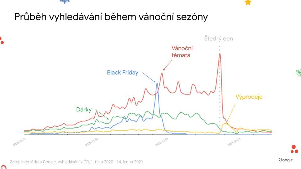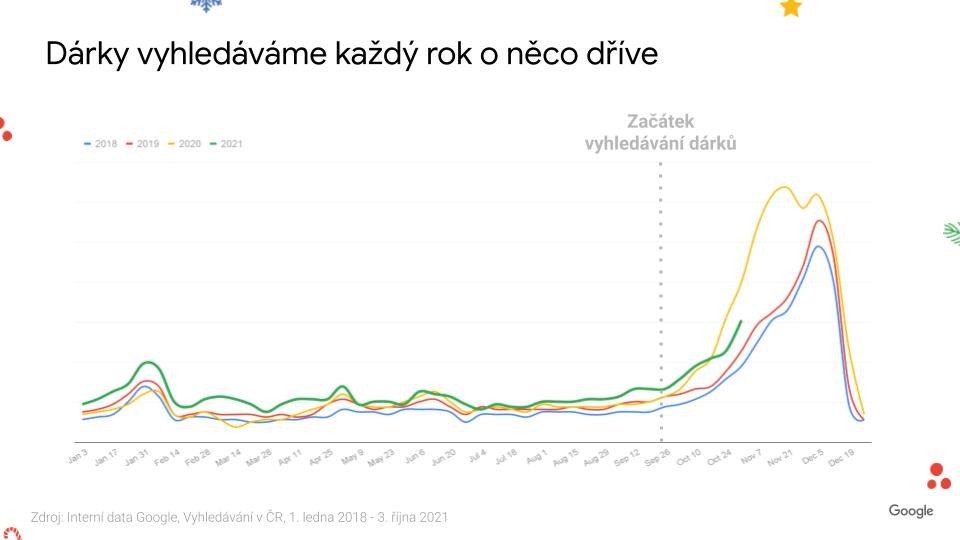 Nejčastěji Češi podle Googlu vyhledávají dárky pro konkrétní osoby, nejvíce pro maminku, o něco méně pak pro tatínka nebo babičku. „Podle dat z loňského roku lze vyhledávající rozdělit do dvou hlavních skupin: část z nich se po dárcích na internetu rozhlíží od první půlky listopadu, druhá skupina začíná až v prvním prosincovém týdnu,“ uvedl obchodní ředitel české pobočky Googlu František Štrupl.