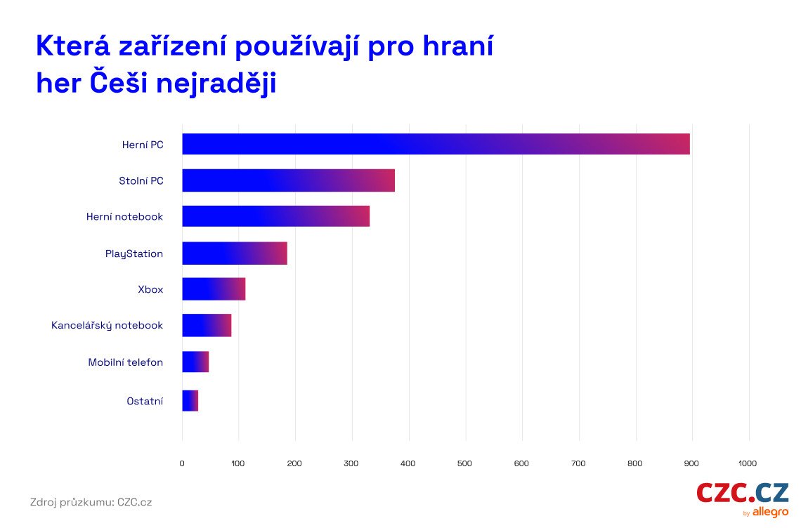 Mezi českými hráči vedou počítače a notebooky. Skoro 62 % aktivně hrajících Čechů využívá pro herní účely nejraději specializované herní nebo stolní PC a 16 % preferuje notebook. Velká část hráčů nicméně střídá různé herní platformy (včetně mobilních telefonů) a skoro 40 % oslovených hraje alespoň občas na herní konzoli. Jen 15 % staví však hraní na některé z nich na první místo.