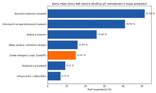 Lidé dokonce začínají umělé inteligenci věřit více než prodavačům nebo influencerům. Podle průzkumu důvěřuje doporučení AI, například ChatuGPT nebo systémům v e-shopech, zhruba každý sedmý respondent (14,8 %), což je více než ti, kdo se při rozhodování spoléhají na prodavače na prodejně (9,22 %) nebo na rady influencerů a odborníků (6,71 %).
