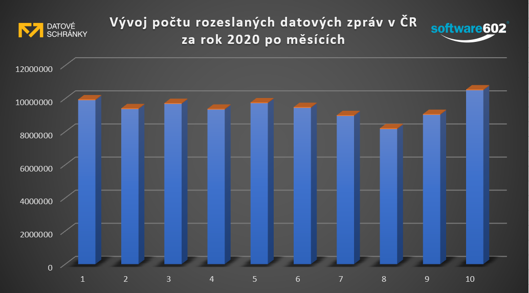 Hranice 10 milionů odeslaných datových zpráv za měsíc padla vůbec poprvé, dodala firma Software602, která se formou jednoho ze subdodavatelů, podílí na chodu Integrovaného systému datových schránek. „Během první vlny pandemie jsme byli svědky rekordního nárůstu počtu nově založených a aktivovaných datových schránek. To se během druhé vlny koronaviru neděje, měsíční přírůstky nově aktivovaných datových schránek odpovídají průměrným měsíčním hodnotám mimo pandemii. Co ale výrazně narůstá, je objem zasílaných datových zpráv,“ upozornil Martin Vondrouš, expert na využívání nových technologií ve společnosti Software602.