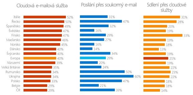 V ostatních státech podle průzkumu provedeného pro firmu Microsoft soukromou elektronickou poštu využívá k přenosu firemních dokumentů už jen třetina zaměstnanců a cloudové podnikové nástroje pro sdílení dokumentů mimo kancelář používají už celé dvě pětiny pracovníků.