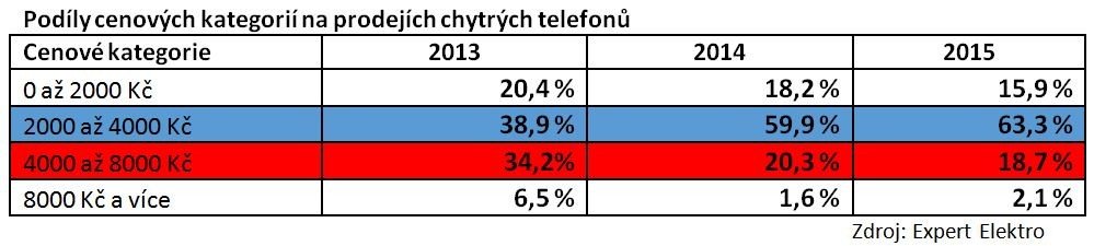Chytré telefony s cenou od 2 000 až 4 000 korun si tak zachovávají stabilní růst svého prodejního podílu, který od roku 2013 narostl bezmála o polovinu na 63,3 %. Nejvíce ztrácela právě střední cenová kategorie, kdy se podíl prodaných smartphonů za cenu 4 000 až 8 000 korun „smrskl“ rovněž téměř dvojnásobně na loňských 18,7 %.