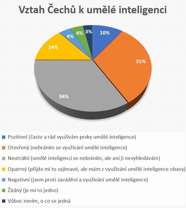 Češi se už několikrát ukázali jako velmi pokrokoví, pokud jde o využívání nových technologií. Nyní se ukazuje, že se pozitivně staví i k umělé inteligenci. Pozitivní nebo otevřený vztah k umělé inteligenci má 41 % lidí, naopak vyloženě negativně se k jejímu zavádění staví jen 4 % lidí.