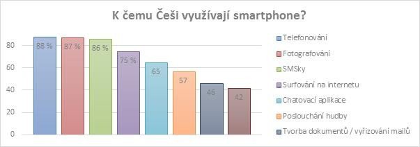 Češi své přístroje stále více využívají k surfování po internetu (75 %) či k online komunikaci (Messenger či Whatsapp). Tu využívají již takřka dvě třetiny uživatelů (66 %). Více než polovina Čechů, konkrétně 57 %, využívá svůj mobilní telefon k poslechu oblíbené hudby. Necelá polovina pak má smartphony k vyřizování mailů či vytváření a editaci dokumentů. Díky neustále se zvětšujícím a kvalitním displejům pak čtyři z deseti Čechů využívají své telefony i ke sledování filmů či seriálů.