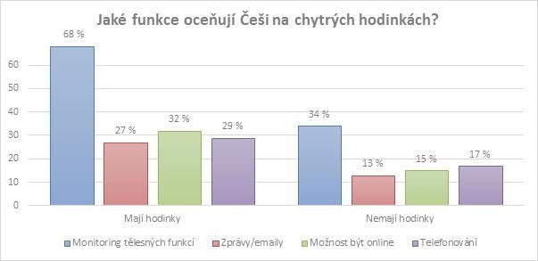 Samostatnou kapitolou jsou i chytré hodinky. Sedm z deseti vlastníků své chytré hodinky využívá především k měření životně důležitých funkcí, jako jsou tlak či srdeční tep. I když většina Čechů zatím chytré hodinky nevlastní, více než třetinu (34 %) láká na těchto zařízeních funkce měření tělesných funkcí. Další z funkcí, která je zajímá, je, že pomocí hodinek by mohli telefonovat (17 %). Naopak skoro 30 % současných majitelů chytrých hodinek tuto možnost již využívá. Třetina majitelů na svých hodinkách surfuje po internetu, sleduje počasí či zprávy. Lidé nevlastnící chytré hodinky nad touto možností stále váhají, k surfování po internetu by je využívalo pouze 15 % z nich. K vyřizování korespondence by chytré hodinky využívalo 13 % dotázaných, v současnosti přitom tuto funkci ráda využívá více než čtvrtina (26 %) majitelů chytrých hodinek.