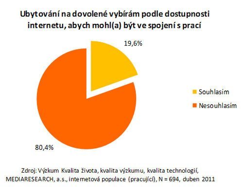 Necelých 20 procent pracujících uživatelů internetu v České republice chce být neustále ve spojení s prací a s ohledem na dostupnost internetu si vybírá i místo pobytu dovolené. Podle výzkumu agentury Mediaresearch, kterého se zúčastnilo 694 respondentů, se k tomuto přístupu přiklání hlavně mladí lidé do 24 let a preferuje ho celá třetina pracujících studentů. O něco častěji drží dobrovolně on-line pohotovost na dovolené muži.