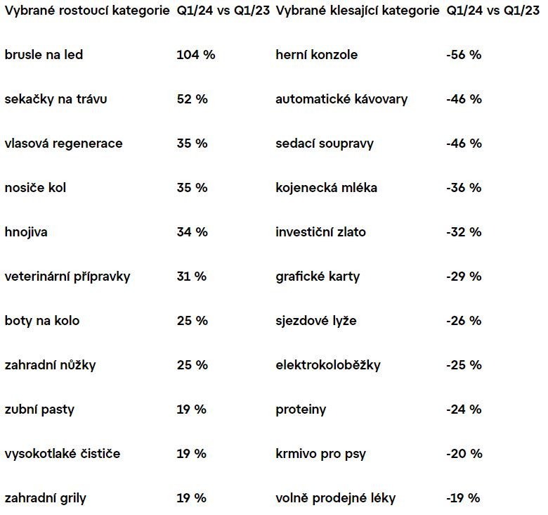 Po letech výraznému zájmu a často dlouhé čekací době se nasytil zájem o herní konzole (-56 %). „Připisujeme to tomu, že kdo měl o některou z nejnovějších konzolí zájem, už si ji pořídil, a nyní jednoduše čeká na nový model,” okomentoval propadák kvartálu Mayer. Podobná je situace s grafickými kartami, které byly často během pandemie vyprodané, nyní jsou v téměř 30% poklesu, stejně jako hit pandemických home officů, automatické kávovary (-46 %). S tím, že se rodí méně dětí, se snížil zájem i o kojenecká mléka, za tento kvartál jsme zaznamenali až 36% pokles,” řekl Mayer a dodal: „Dalším propadákem jsou volně prodejné léky (-19 %), v tomto případě to přičítáme výpadku Nurofenu v lékárnách na přelomu roků 2022 a 2023, kdy se tedy zájem o tento typ zboží na internetu výrazně zvýšil.”