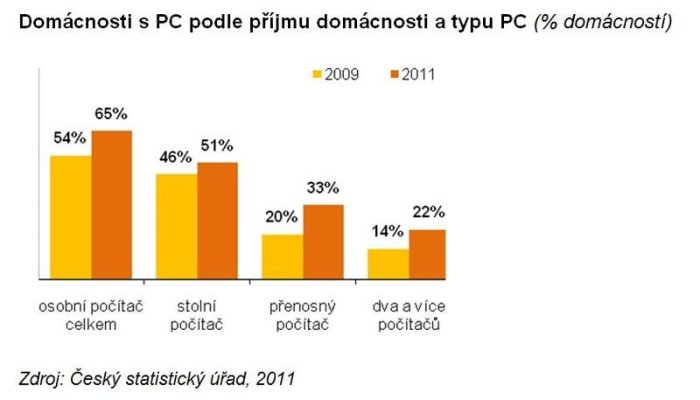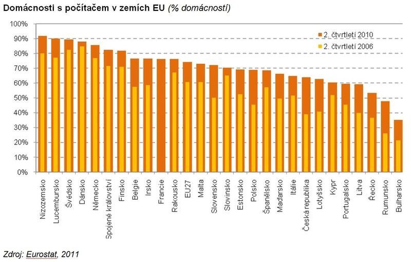 Z nedávného průzkumu ČSU vyplývá, že i přestože ve druhém čtvrtletí roku 2011 bylo v ČR bezmála 2,7 mil. domácností (65 procent) vybavených počítačem, stále jsme hluboko pod průměrem zemí Evropské unie.