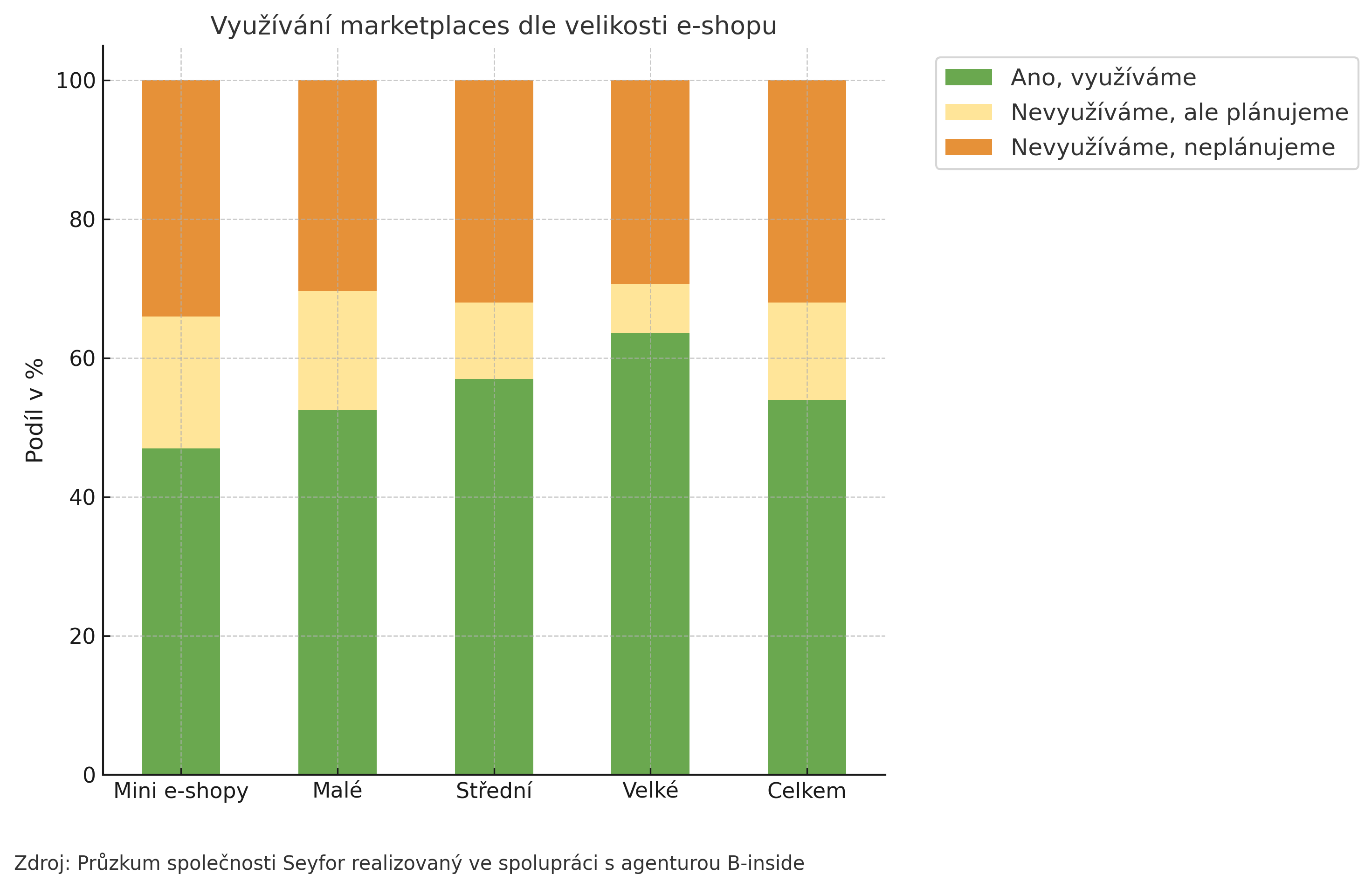 Čeští obchodníci obecně vnímají marketplaces jako další vhodný kanál, kde oslovit nové zákazníky a zviditelnit se. Proto již 54 % e-shopů marketplace aktivně využívá a dalších 14 % ho plánuje nasadit.