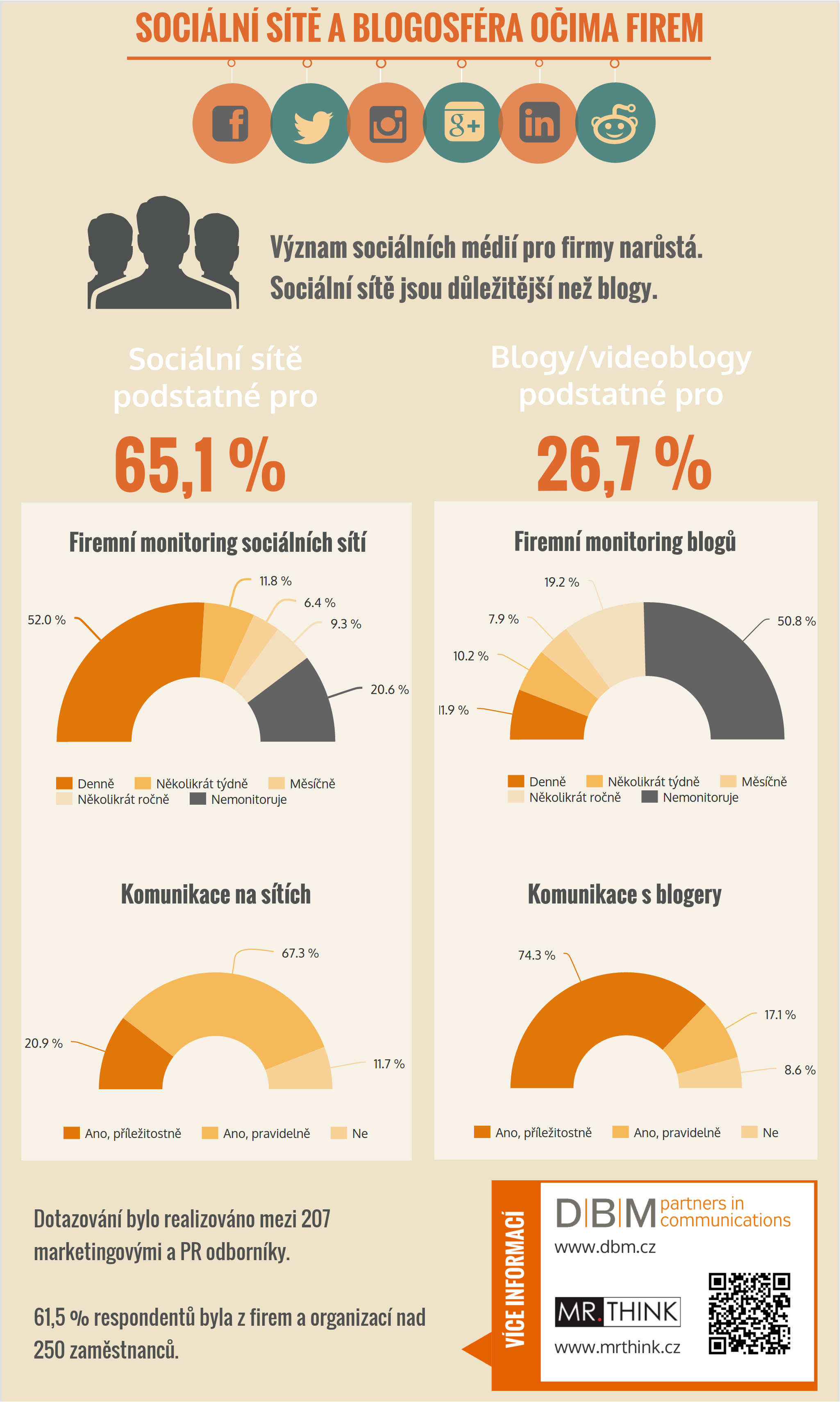 Význam sociálních sítí i blogů pro firmy a organizace meziročně vzrostl, přesto některé velké podniky sociální média nadále ignorují. Denně sociální sítě monitoruje více než polovina (52 %) firem a blogy či videoblogy více než desetina (11,9 %). Překvapením je, že sociální sítě vůbec nesleduje 20,6 % respondentů, u blogosféry je to dokonce 50,8 %.