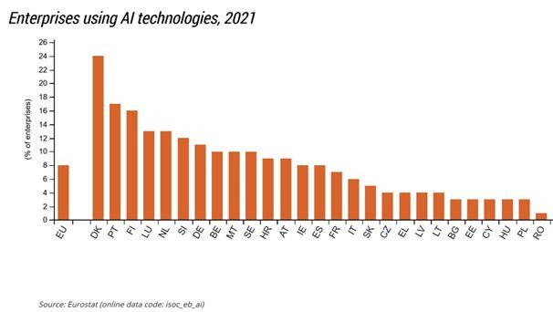 Podle aktuálních dat Eurostatu využívají umělou inteligenci v ČR pouze čtyři procenta firem s více než deseti zaměstnanci. Evropský průměr je osm procent. Mezi jednotlivými státy Evropské unie jsou výrazné rozdíly. Nejrozšířenější jsou technologie umělé inteligence v Dánsku (24 %), kde je zavádění AI třikrát rychlejší než evropský průměr. Na ocase žebříčku je Rumunsko s pouhým jedním procentem.