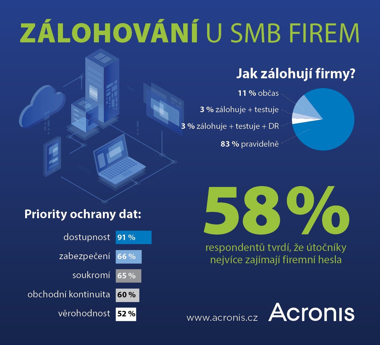 Podle lokálního průzkumu společnosti Acronis věnovaného zálohování dat mezi českými a slovenskými SMB podniky pravidelně zálohuje drtivá většina firem (89 %), avšak jen 6 % z nich zároveň testuje obnovu dat. Respondenti přitom v oblasti kybernetické ochrany dat kladou na dostupnost podnikových dat hlavní důraz.