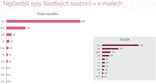 Drtivá většina škodlivých souborů (97 %) byla v České republice v uplynulých 30 dnech distribuována e-mailem. Evropský průměr je nižší (80 %), významnou roli v šíření nebezpečných souborů hrají i různé webové stránky. Nejčastěji byly v e-mailech v ČR šířeny soubory .exe (68 %), na druhém místě byl formát .docx (18 %). V Evropě je ve většině případů používán k šíření malwaru a hrozeb v e-mailech také formát .exe a na druhém místě je formát .bat.