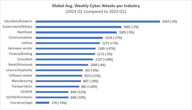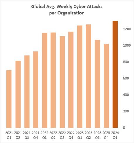 První čtvrtletí roku 2024 přineslo další posun v kybernetických válkách. Kyberbezpečnostní společnost Check Point Software Technologies zaznamenala výrazný nárůst kyberútoků, kdy v 1. čtvrtletí 2024 došlo k 28% nárůstu průměrného počtu kybernetických útoků na jednu organizaci v porovnání s posledním čtvrtletím roku 2023. Největší nápor směřuje na vzdělávací a výzkumné organizace.