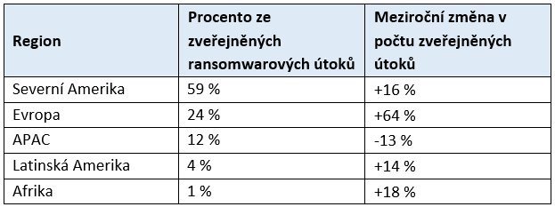V 1. čtvrtletí 2024 byla ransomwarovými útoky nejvíce zasažena Severní Amerika, 59 % z téměř 1 000 zveřejněných ransomwarových útoků, následovala Evropa (24 %) a APAC (12 %). Největší meziroční nárůst nahlášených ransomwarových útoků naopak zaznamenala Evropa, a to o alarmujících 64 %. Důvodem může být větší digitalizace služeb a regulační prostředí, které mohou z organizací učinit zranitelnější nebo viditelnější cíle.