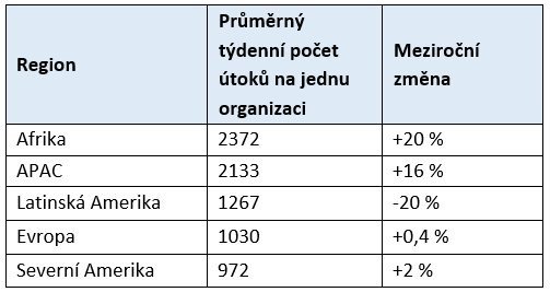 Zdaleka největší nápor je směrován na vzdělávací a výzkumné organizace, kdy se každá společnost musela vyrovnat s v průměru 2 454 útoky týdně. Následuje vládní a vojenský sektor (1 692 útoků týdně na jednu společnost) a zdravotnictví (1 605 útoků týdně na jednu organizaci). S ohledem na to, že jde o klíčová odvětví pro fungování společnosti, jde o alarmující čísla.
