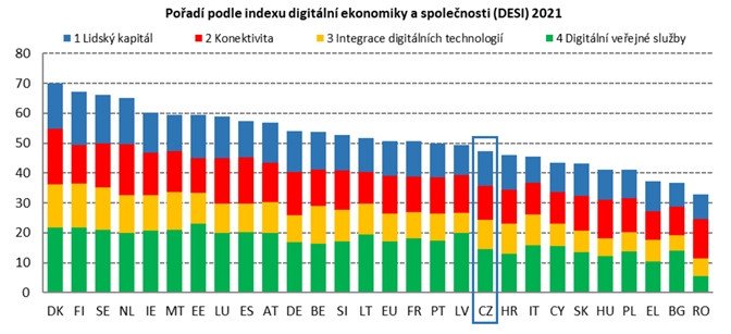 Podle výsledků Indexu digitální ekonomiky a společnosti Digital Economy and Society Index (DESI) za rok 2021 se Česko mezi 27 členskými státy EU řadí na 18. místo, a tedy oproti roku 2020 si o jedno místo pohoršilo. Lépe si ČR vede v integraci digitálních technologií, kde zaujímá 15. příčku. Dominuje ale v oblasti AI, kde s přehledem obsadila první pozici.