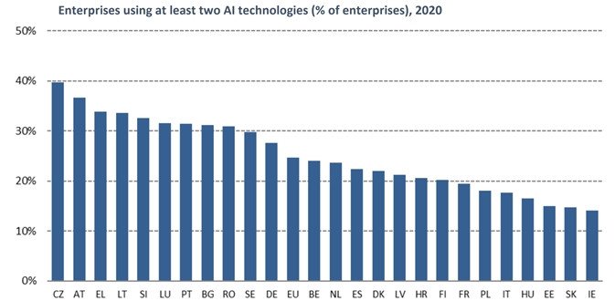 Zcela jiná situace je v zavádění umělé inteligence. Přijetí dvou nebo více technologií umělé inteligence ve firmách je nejvyšší v Česku (40 %), následuje Rakousko (37 %), Řecko a Litva (obě po 34 %). Naopak nejnižší je v Irsku (14 %), na Slovensku a v Estonsku (v obou případech po 15 %). Záměrem Evropské komise je, aby více než 75 % společností v EU přijalo technologii AI do roku 2030.