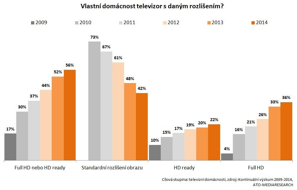 Modernější typy televizorů přinášejí svým majitelům kvalitnější obraz díky vyššímu rozlišení obrazovky: již 56 % televizních domácností má v současnosti televizor s Full HD nebo HD ready rozlišením (36 % přímo Full HD, tj. rozlišení 1 920 x 1 080). Standardní rozlišení obrazu (SDTV) naopak klesá: zatímco v roce 2010 se hlásilo k vlastnictví televize s touto kvalitou obrazu 73 % domácností, v loňském roce jich bylo již jen 42 %.