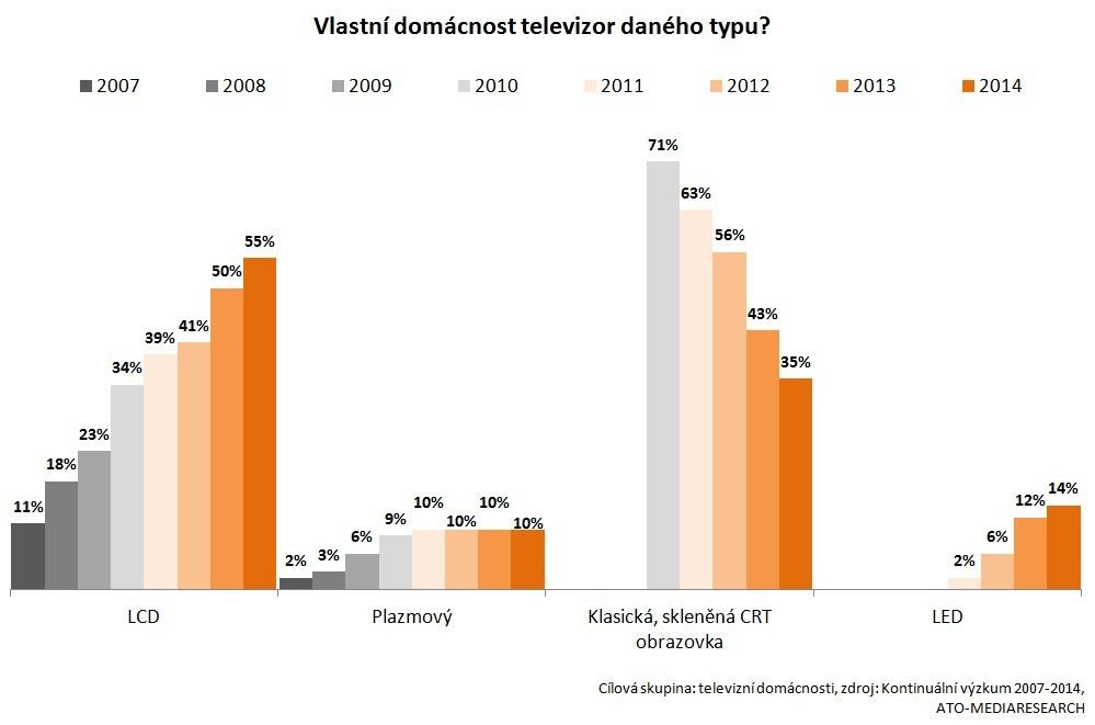 V televizních domácnostech v posledních několika letech nejvíce narostlo zastoupení LCD televizí. Aktuálně je má doma 55 % domácností, zatímco v roce 2007 její vlastnictví deklarovalo pouhých 11 %. LCD je v tuto chvíli nejrozšířenějším typem televizoru. V posledních čtyřech letech dále mírně stoupá i popularita LED televize, v roce 2014 ji vlastnilo 14 % televizních domácností. Stabilní je naopak v posledních letech podíl televizních domácností vlastnících plazmovou televizi, drží se na úrovni 10 %.