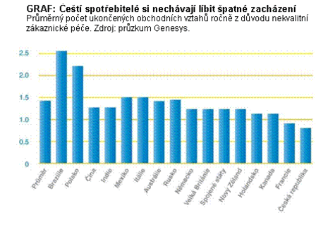 „Zatímco Češi a Francouzi ukončí kvůli nespokojenosti méně než jeden obchodní vztah, Brazilci a Poláci více než dva,“ shrnul závěry mezinárodního průzkumu Patrik Ort, odborník na péči o zákazníky firmy Genesys, která je součástí společnosti Alcatel-Lucent.