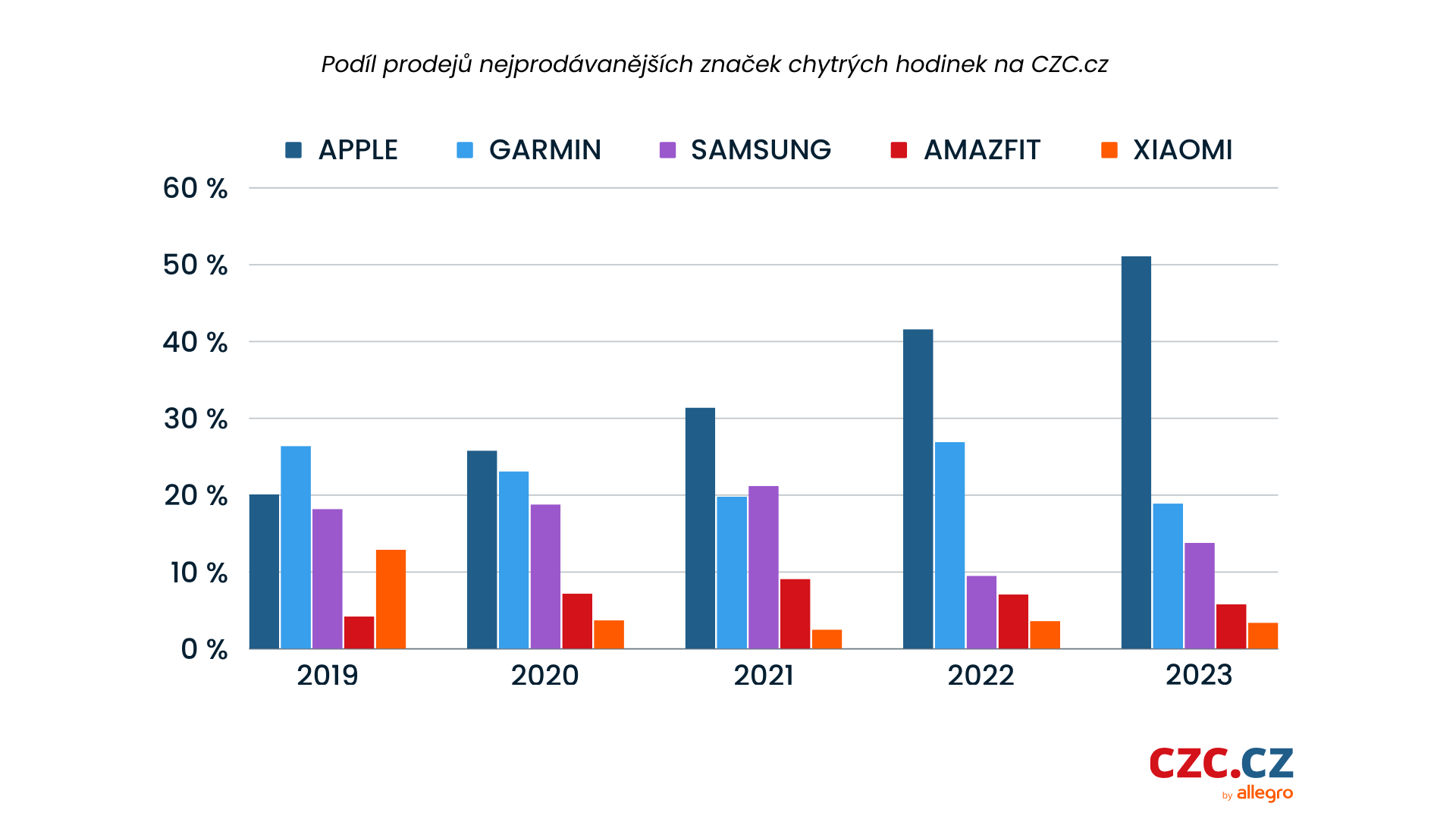 Graf podílu prodejů nejprodávanějších značek chytrých hodinek od CZC za posledních pět let dokazuje, že zájem českých zákazníků se soustředí na výkonnější a dražší modely. Zároveň ukazuje neustálý růst hodinek Apple, které si letos z celkového trhu této kategorie ukously více než 50% podíl. O dalších více než 30 % se dělí značky Garmin a Samsung, z ostatních výrobců mají významnější podíl na českém trhu ještě značky Amazfit a Xiaomi.