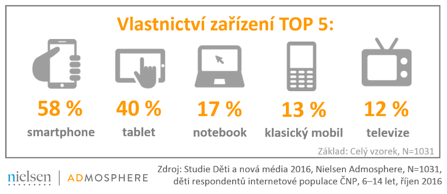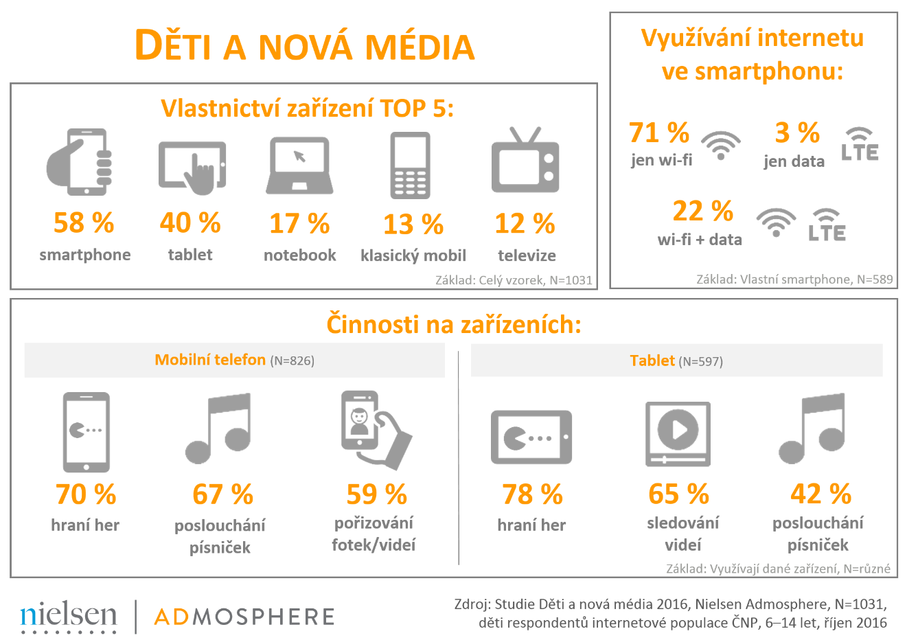 Jak na tom jsou konkrétně české děti ve věku 6–14 let, zjišťovala studie provedená společností Nielsen Admosphere v říjnu 2016 na vzorku 1 031 dětí.