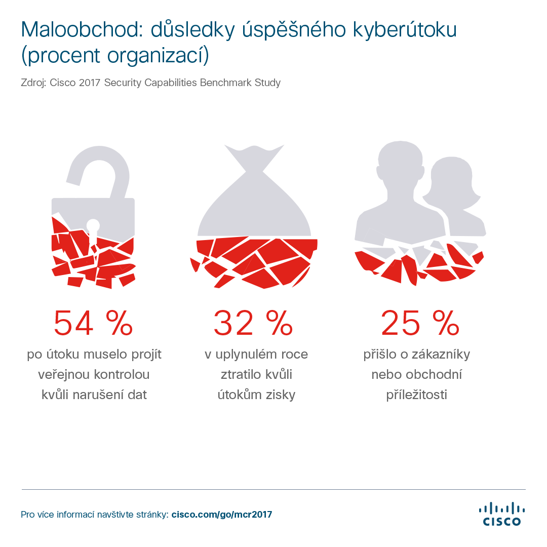 - Maloobchod: 32 % podniků říká, že v posledních několika letech se jim kvůli kybernetickým útokům snížily zisky. Zhruba 25 % pak ztratilo zákazníky nebo obchodní příležitosti.