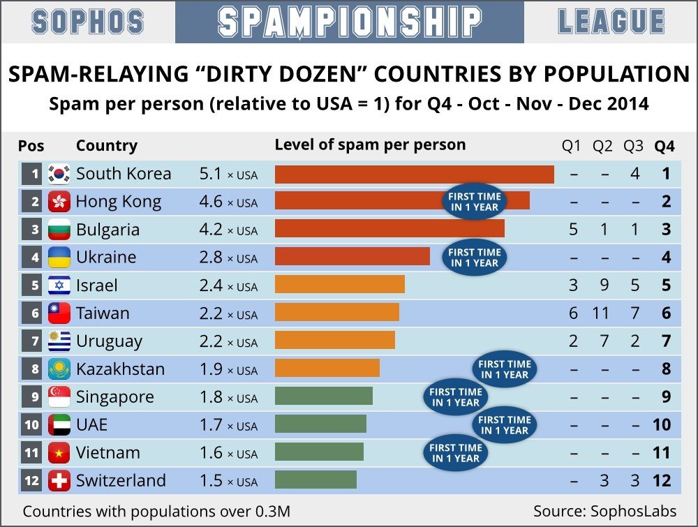 Společnost Sophos zveřejnila zprávu Dirty Dozen za 4. čtvrtletí 2014, která obsahuje přehled zemí s nejvyšším podílem na rozesílání nevyžádané pošty. Největším překvapením je, že Spojeným státům se konečně podařilo opustit první příčku nepopulárního žebříčku.