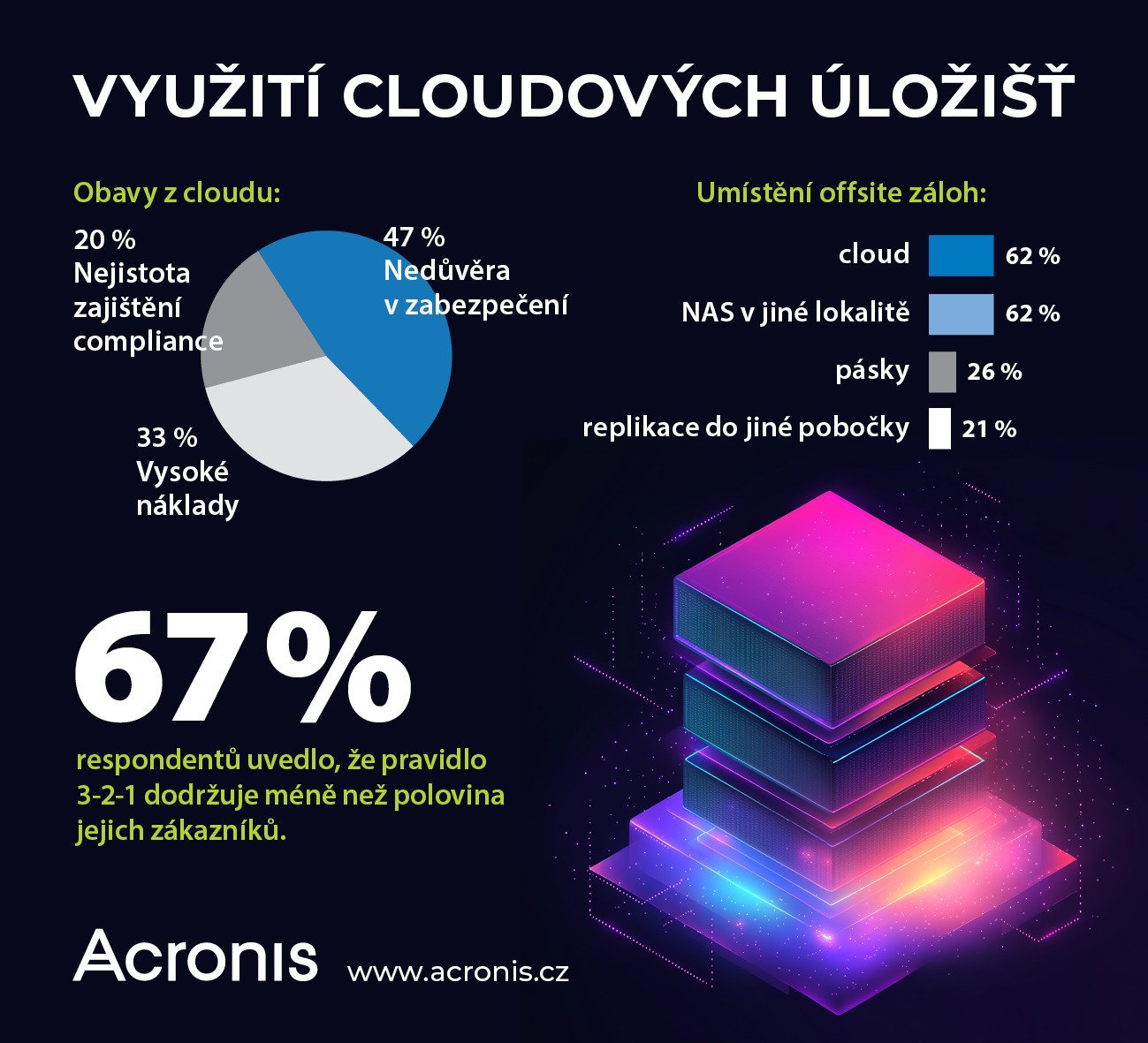 Čeští a slovenští partneři společnosti Acronis uvedli, že pokud jejich zákazníci využívají ke svému zálohování úložiště mimo firmu, 62 % podniků již preferuje cloudové úložiště. Nicméně průzkum také ukázal, že významné procento organizací stále nedodržuje u svých zálohovacích procesů základní pravidlo 3-2-1, čímž se vystavují potenciálně fatálním problémům.
