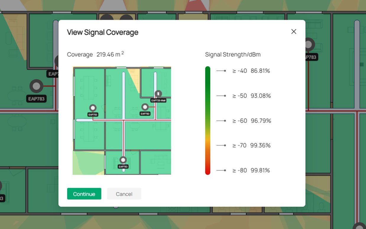Omada Design Hub nabízí pokročilé vizualizační nástroje, které poskytují okamžitý přehled o kvalitě bezdrátového pokrytí. Pomocí interaktivních heatmap lze v reálném čase sledovat sílu signálu v jednotlivých částech objektu a identifikovat problematická místa s nedostatečným pokrytím.