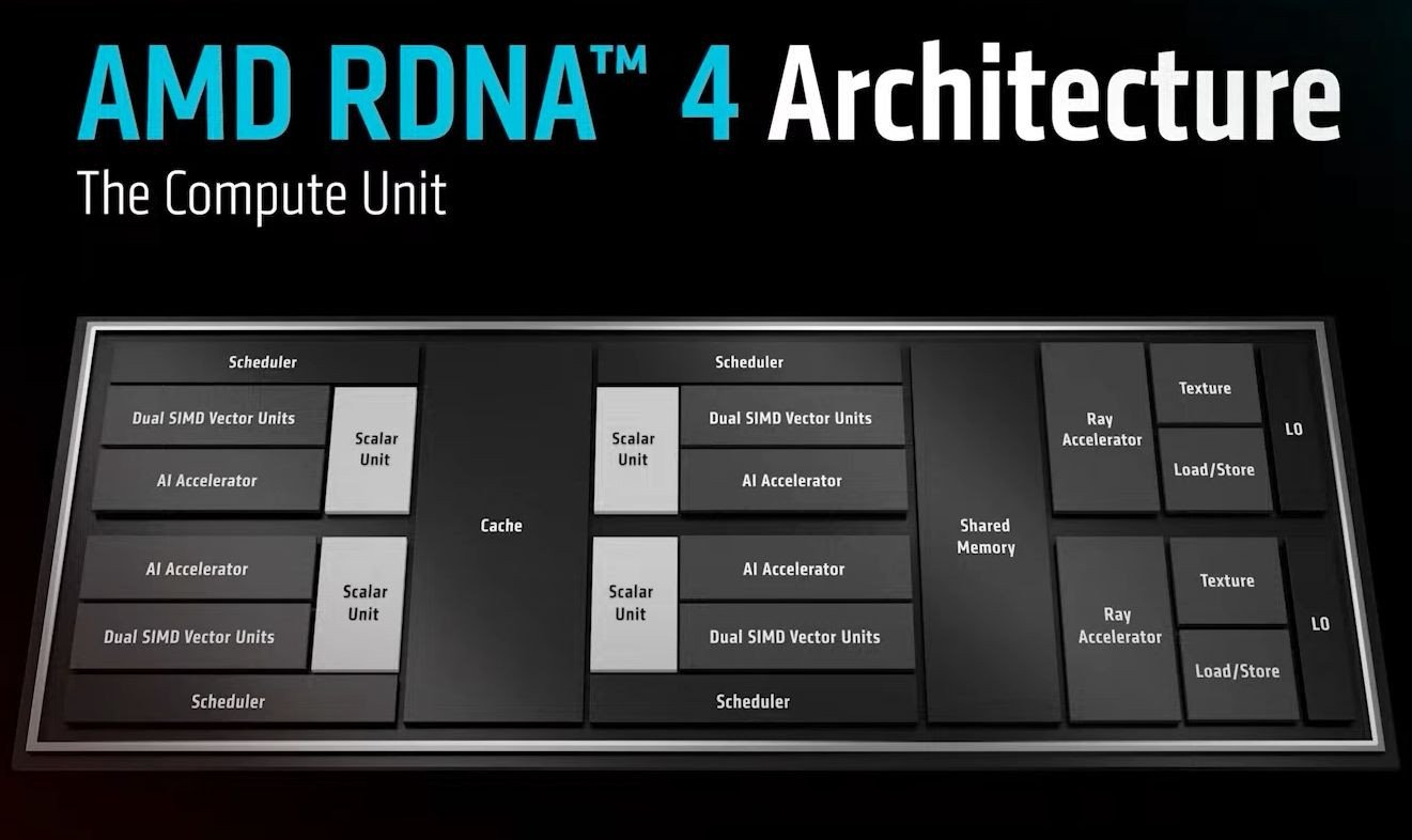 Čipy staví na nejnovější grafické architektuře RDNA 4, která přináší řadu důležitých vlastností a inovací. Namátkou jmenujme například inovované výpočetní jednotky (CU), vyšší efektivitu, rychlejší zpracování příkazů, pokročilé programování shaderů, vylepšenou kompresi paměti a alokaci registrů, vylepšené zobrazovací a mediální jádro nebo (u AMD vůbec poprvé) vykreslování snímků pomocí strojového učení. Celkově podle AMD architektura RDNA 4 dokáže podat až o 40 % lepší výkon než RDNA 3.