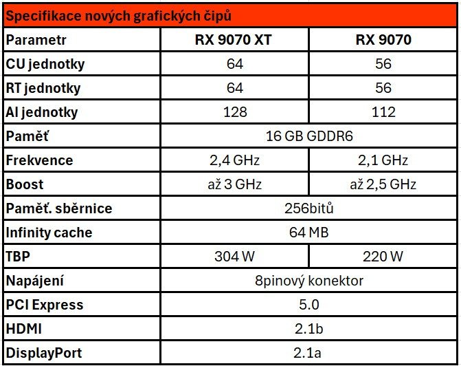 Vyšší model RX 9070 XT nabízí 64 výpočetních jednotek (CU), 64 hardwarových akcelerátorů ray tracingu a 128 akcelerátorů umělé inteligence. Takt (během boostu) dosahuje téměř 3 GHz a dá se předpokládat, že přetaktované GPU tuto hranici jistě překročí. Karta je vybavena 16 GB VRAM na 256bitové sběrnici a tato konfigurace paměti platí i pro model RX 9070 („bez XT“). Vlajková loď má celkový příkon (TBP) 304 W. Model RX 9070 snižuje specifikace na 56 CU, 56 hardwarových akcelerátorů ray tracingu a 112 AI akcelerátorů. Maximální takt činí 2,52 GHz. Na druhou stranu je výrazně nižší i spotřeba, která činí 220 W.